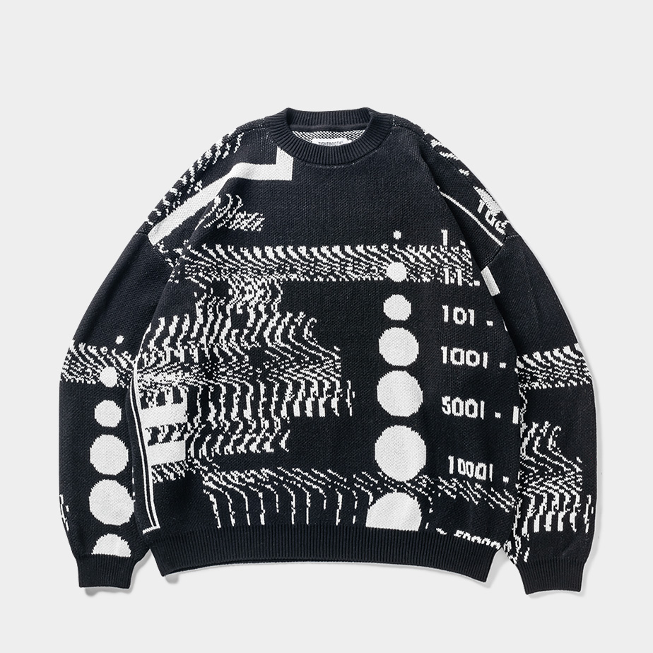 アーティスト河村康輔氏 のグラフィックCOVID-19の一部を切り取り、編み地全面に落とし込んだデザインニットセーター。