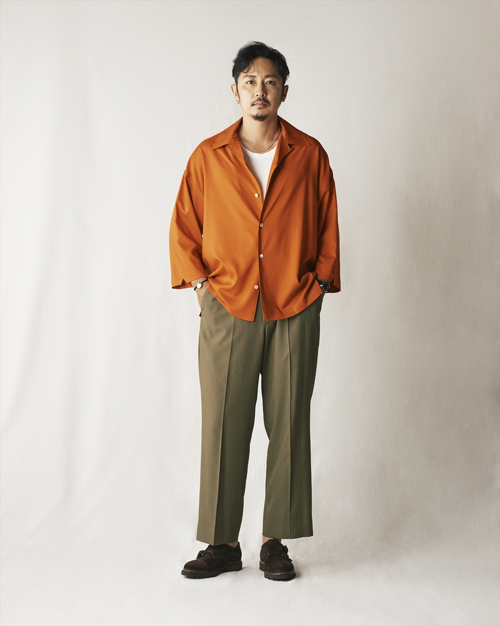 ポリエステルの芯にレーヨンを巻き付けたコアヤーン糸を作り、製織した生地を採用したオープンカラーレーヨン七分袖シャツ。
