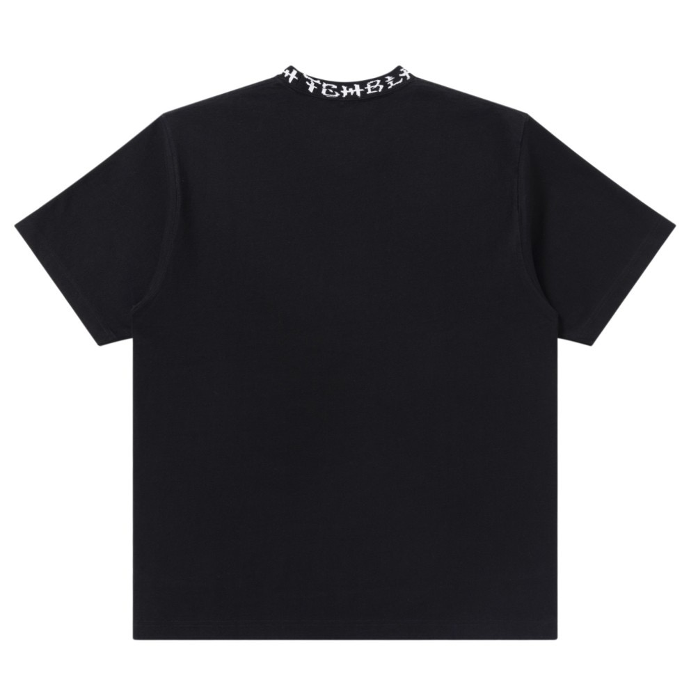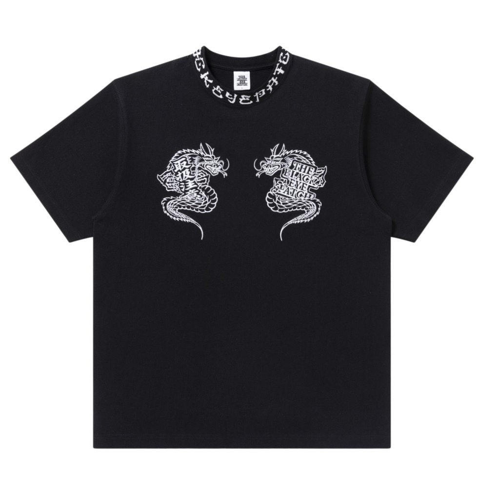 "OG LABEL" と "取扱注意" のアイコンを抱えた龍のグラフィックが両胸部分に刺繍で施され、首のリブ部分にオリジナル KANJI フォントのブランドネームを織り込んだ T シャツ。