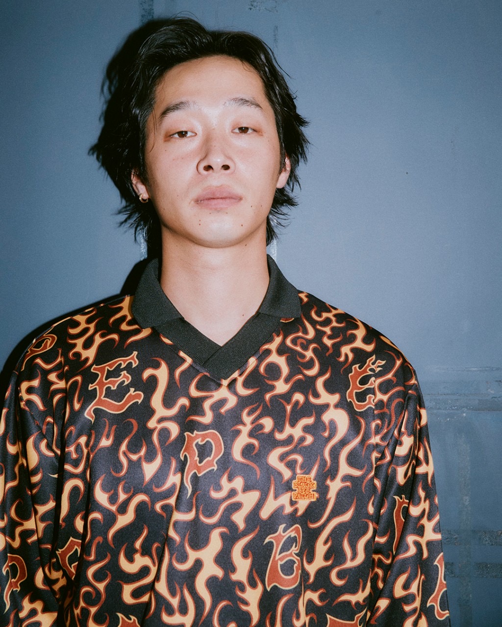 ブランド名を示す "BEP" の文字を落とし込んだオリジナルファイヤーパターン柄で構築した襟付き総柄ロングスリーブジャージー。