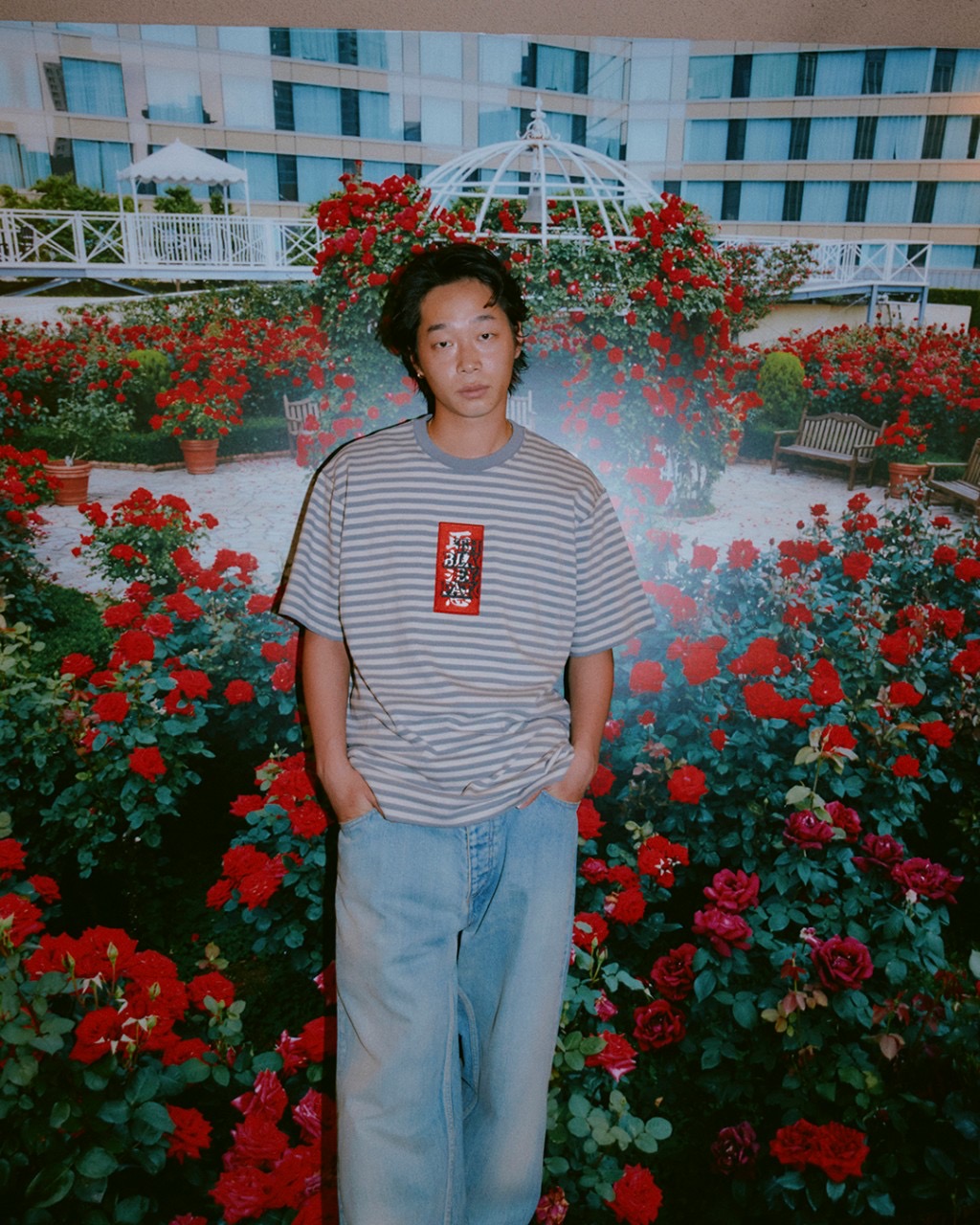 ジャガードでブランドオリジナルのボーダー柄のボディに "取扱注意" LABELのグラフィックを刺繍した T シャツ。
