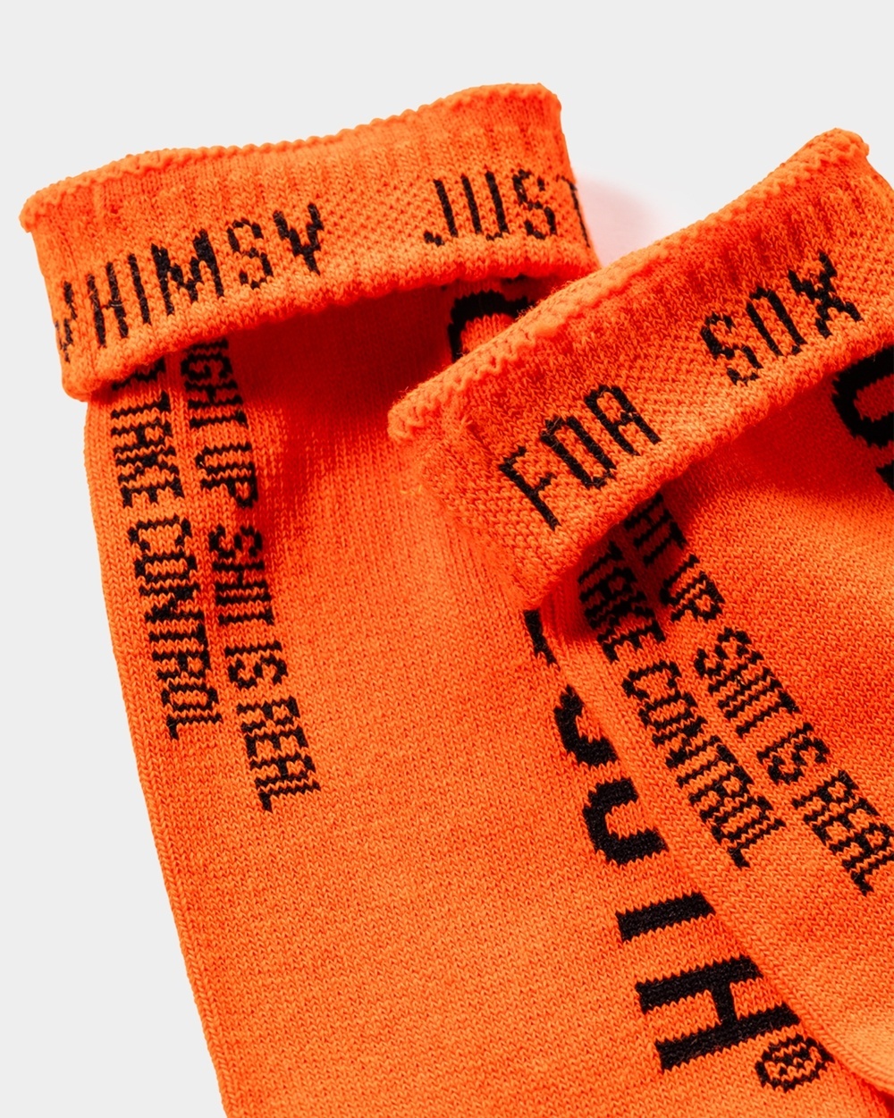 WHIMSYの定番ソックスをベースにブランドネームデザインをジャガード編みで表現。