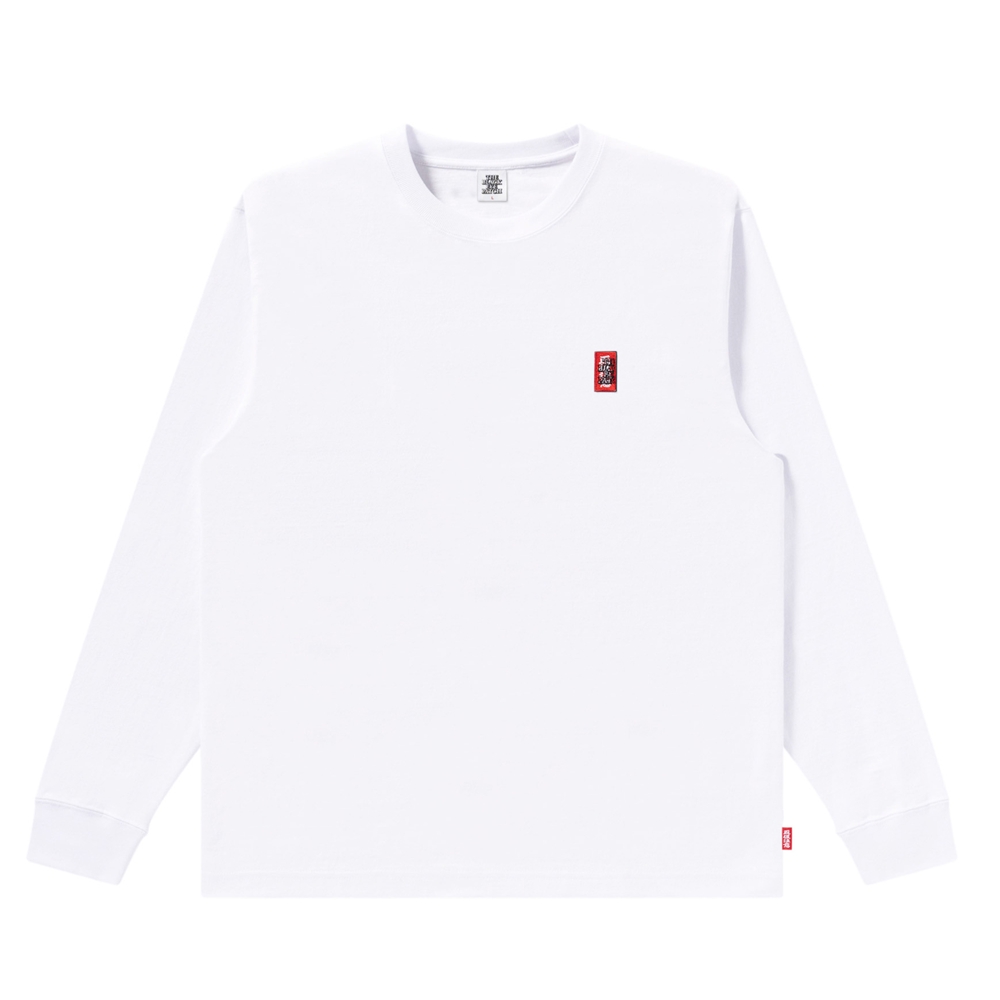 左胸に "取扱注意" LABEL ロゴグラフィックのスモールワッペンを配置したロングスリーブ T シャツ。