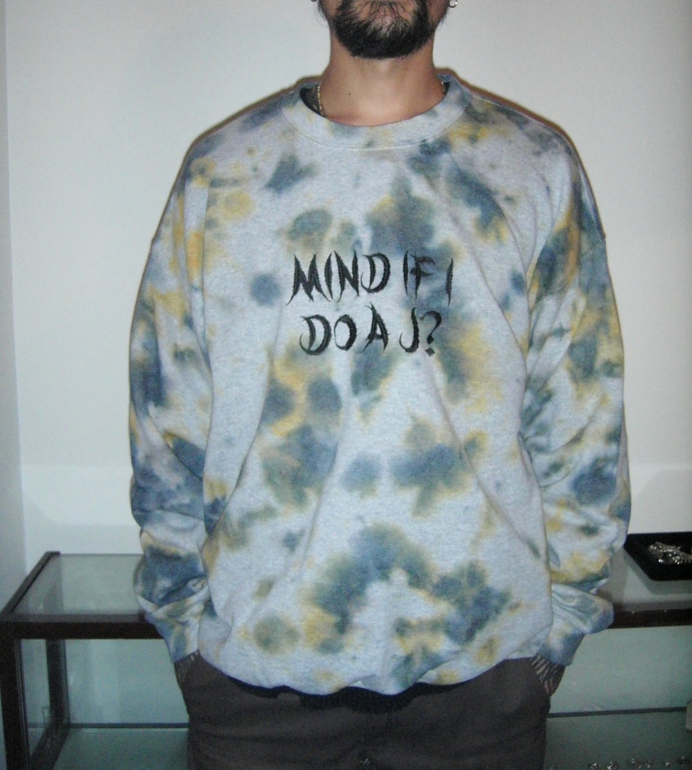 日本のTIE DYEアーティストのパイオニアであるDEAD DYEにタイダイ染をしてもらい、映画big lebowskiの作中でのセリフ、"一服Jしていい?"をLeafフォントでデザインされ刺繍で施したタイダイスウェット。