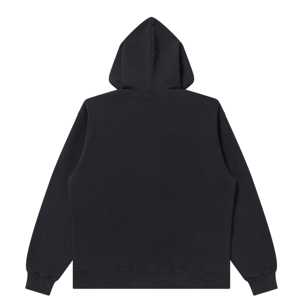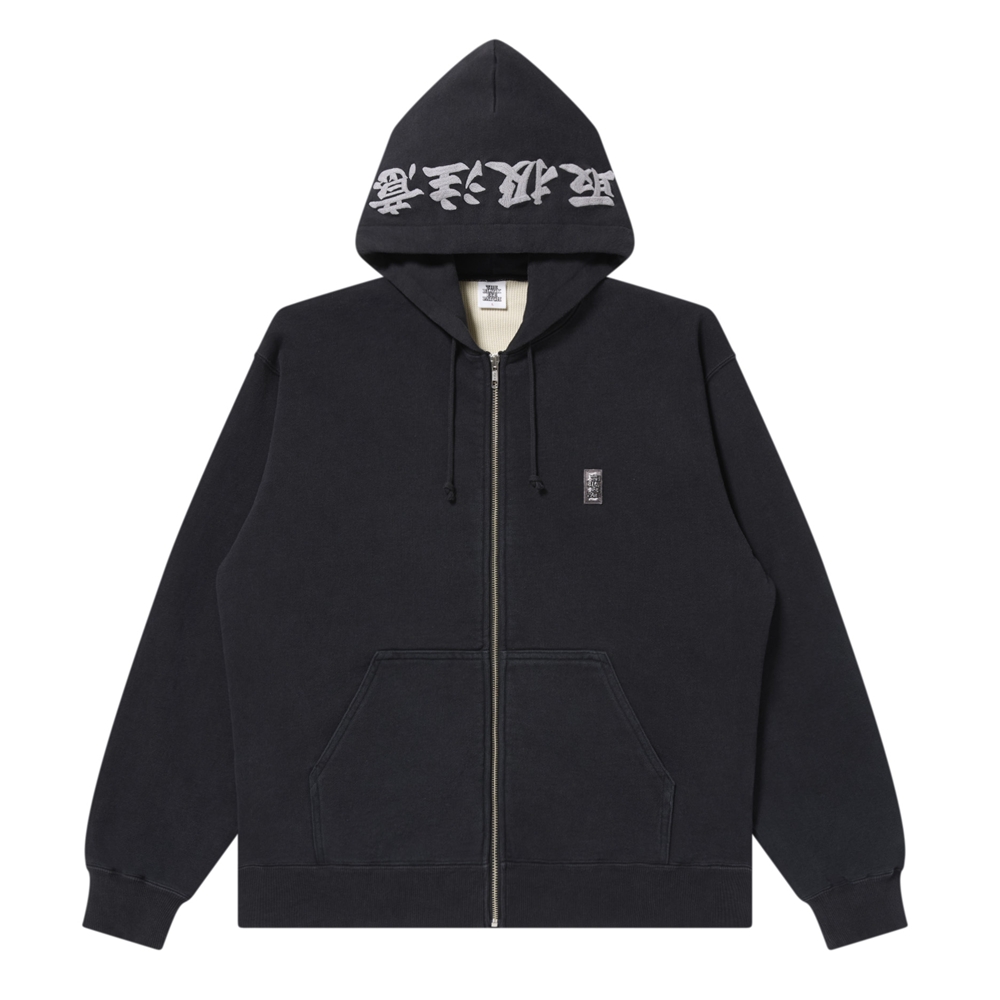 フード部分の "取扱注意" 部分をリフレクター糸で刺繍をした "SMALL HWC" ロゴワッペンのジップフーディー。