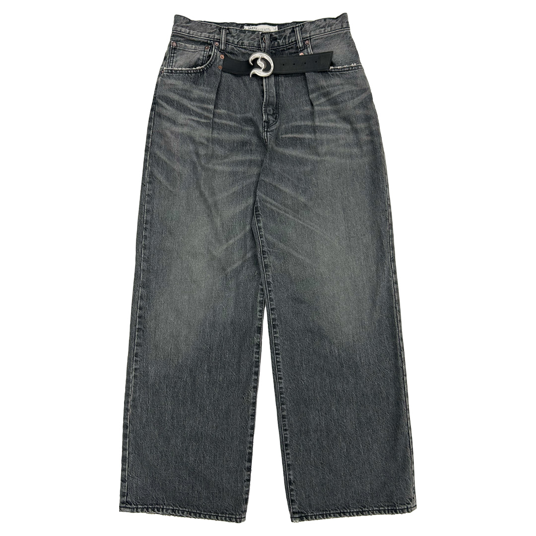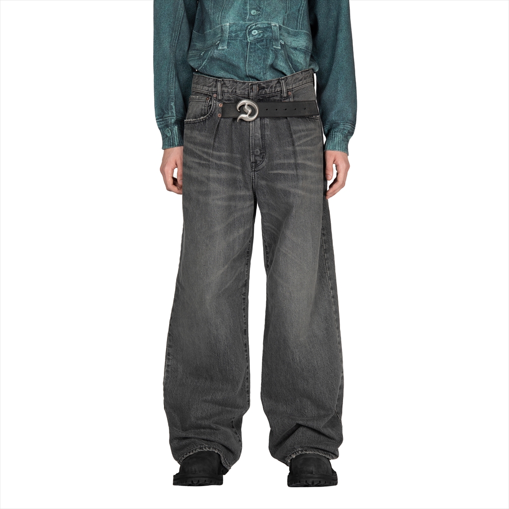 フロントにDバックルベルトを装備したスーパーワイドデニムパンツ。
