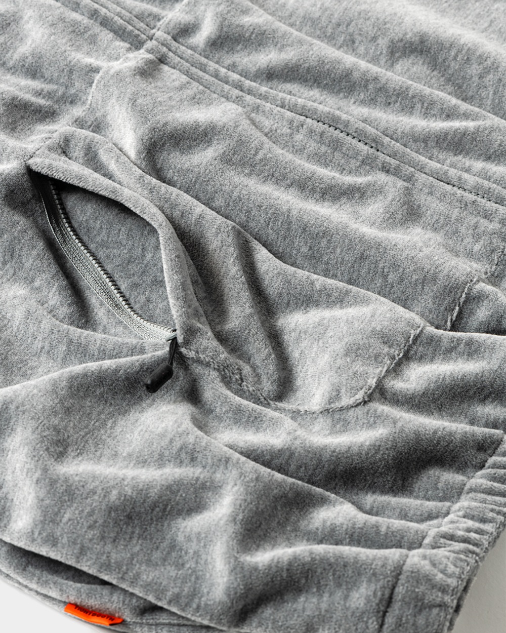 程よい落ち感と滑らかな肌触りのベロア生地を表地に採用したフード付きトラックジャケット。
