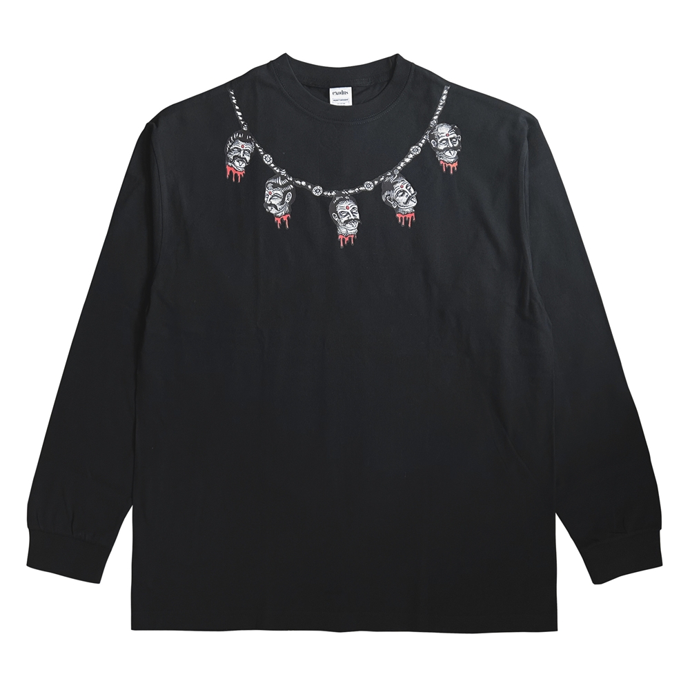 丸胴ボディーを使用したカーリー・マーのネックレスプリント長袖T。
