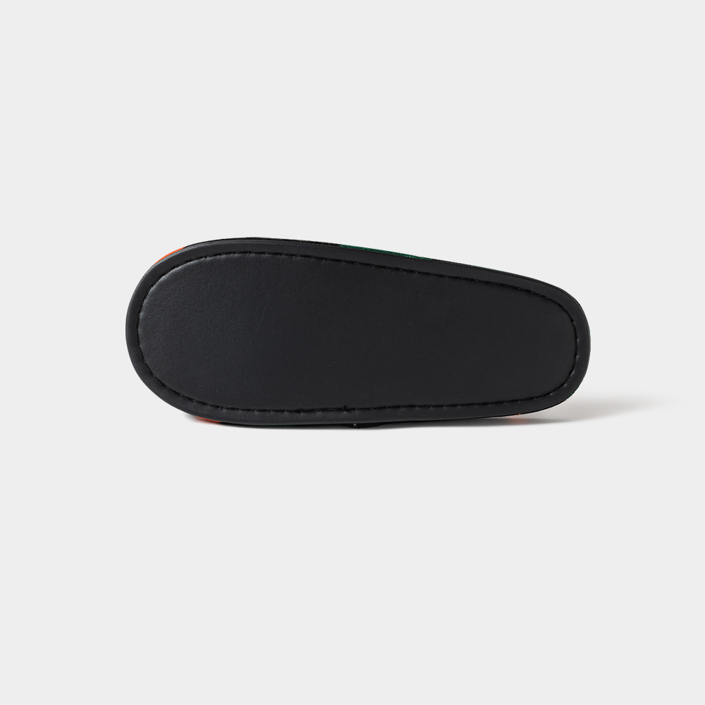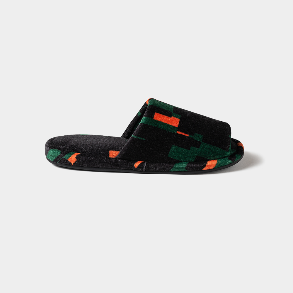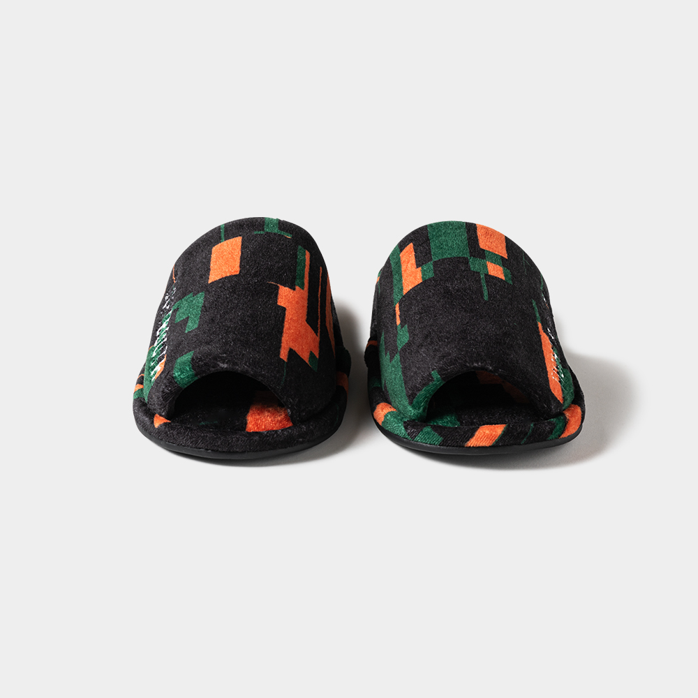 定番のベロア生地に総柄プリントしたルームサンダル。