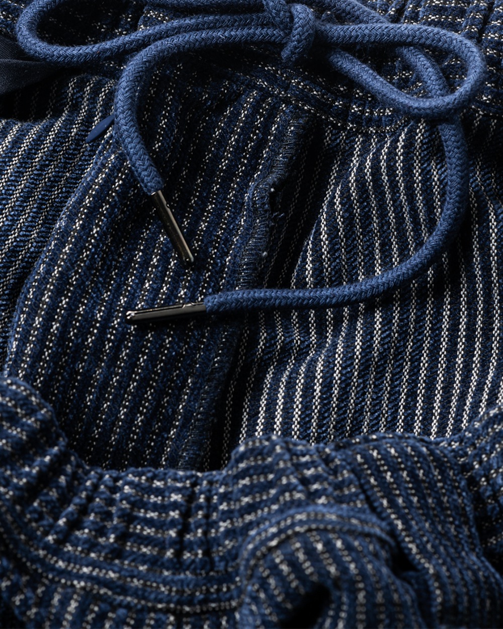 ゴム入りのウエストバンドは、ベルトループと内出しのスピンドルコードを装備。