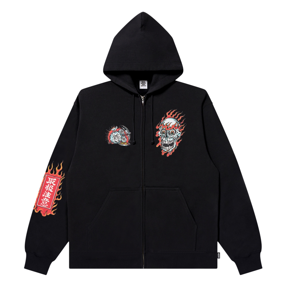 タトゥーアーティストの UE 氏のグラフィックが両胸、右袖 、背中にプリントされたジップアップフーディ。