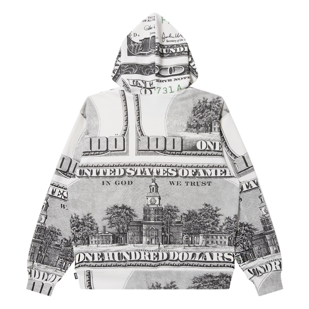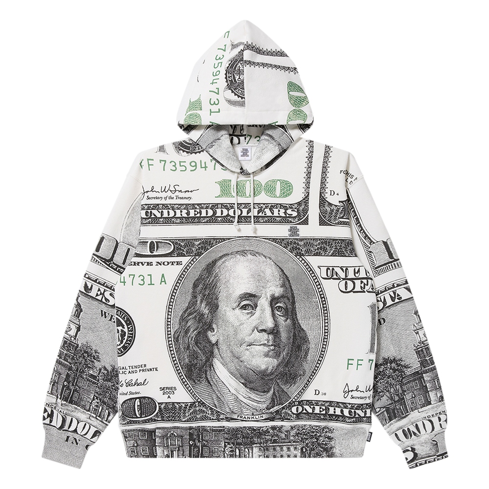 旧 100 ドル札を全面にプリントしたプルオーバーフーディ。