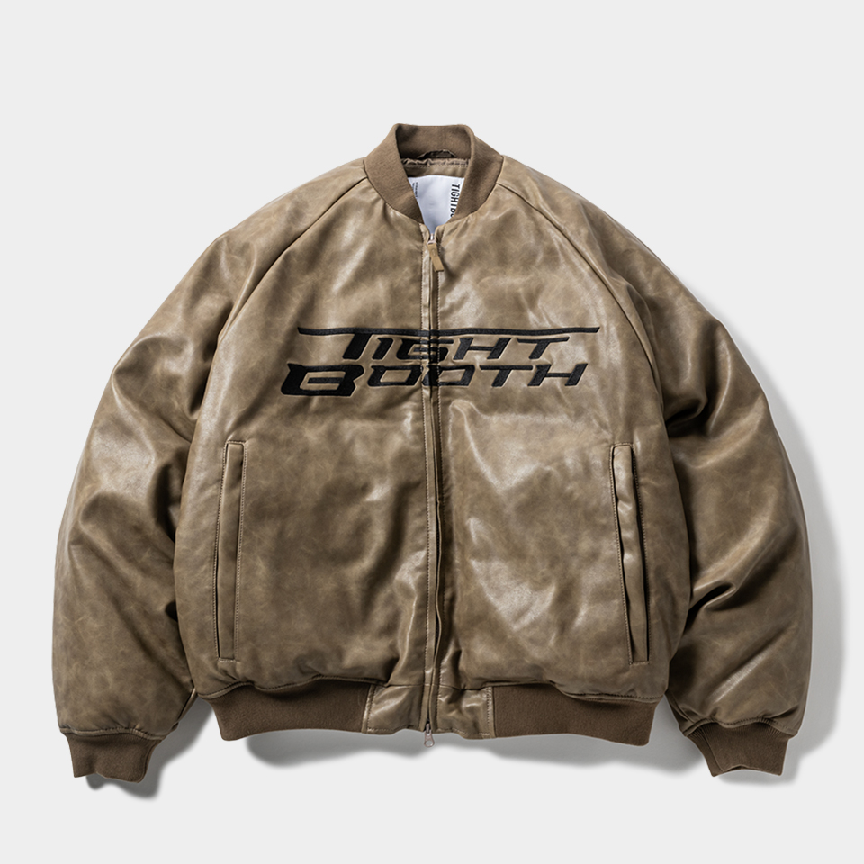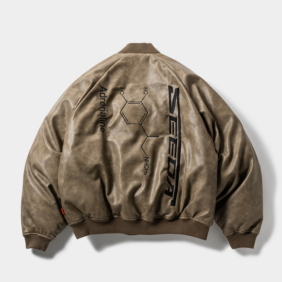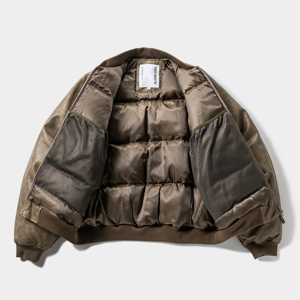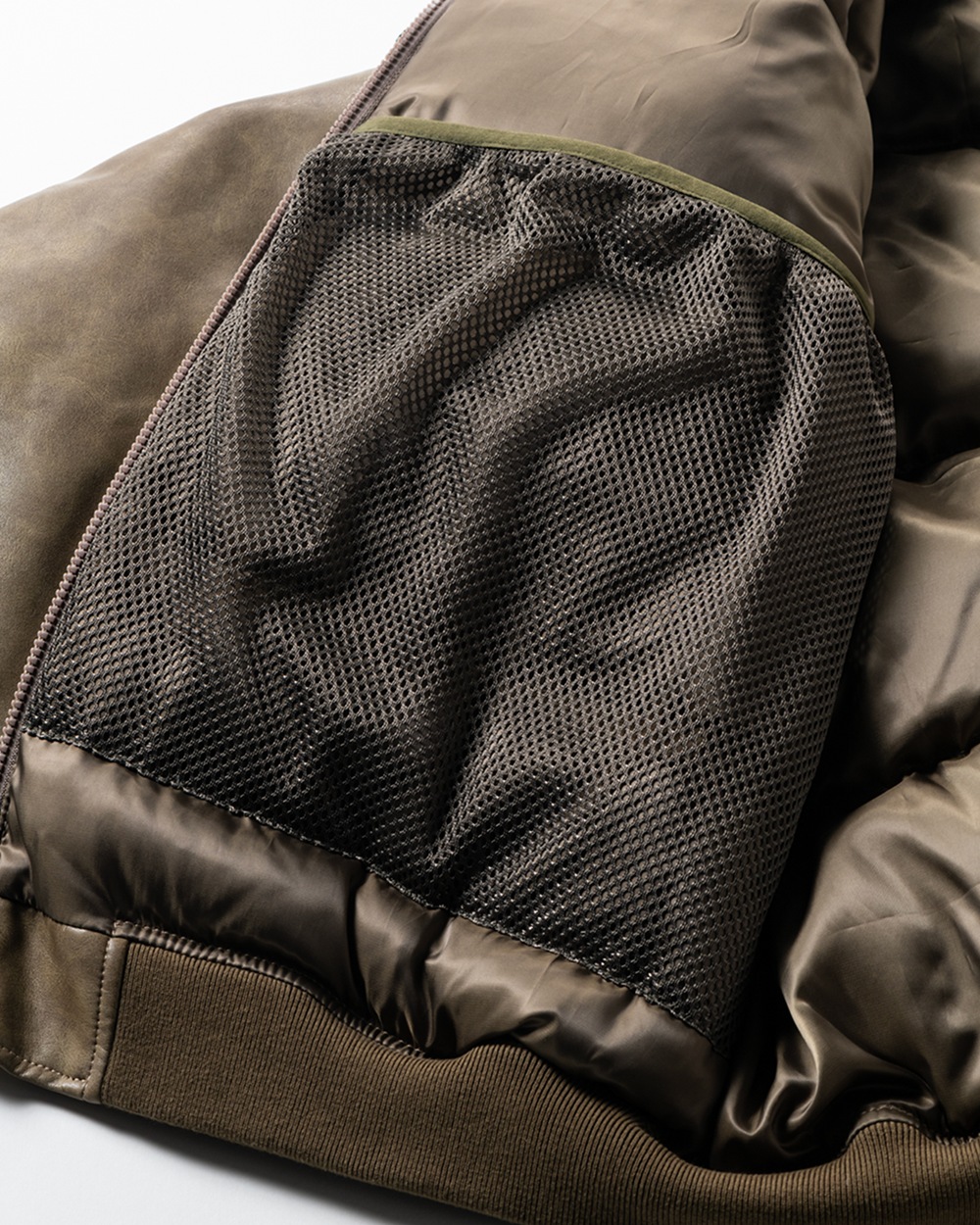 フェイクレザーを使用したMA-1スタイルのダウンジャケット。