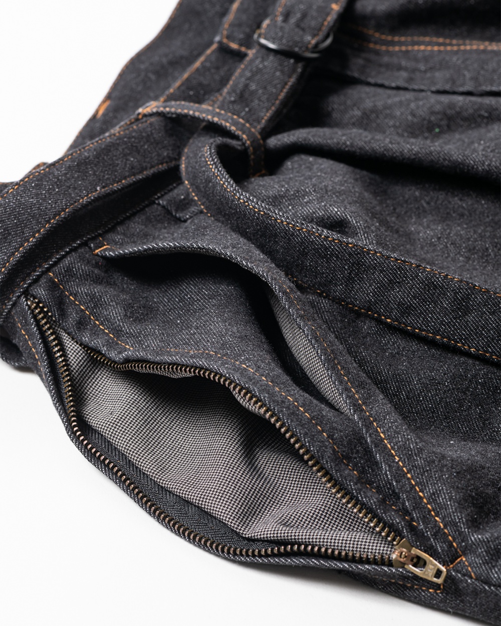 アウトシームに沿ったファスナーポケット、隠しマグネットボタン仕様のバックポケットを搭載。