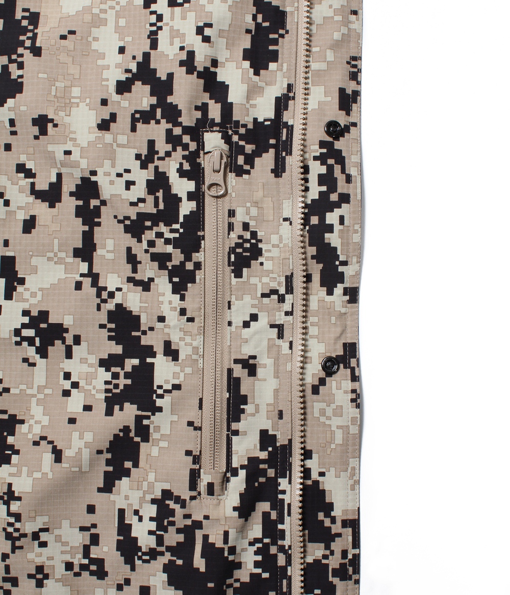 表地は引裂きや摩耗に強く、摩擦強度が高いオリジナルのデジタルカモ柄リップストップ生地を使用し、裏地には袖通しの良いポリエステル生地を使用しています。