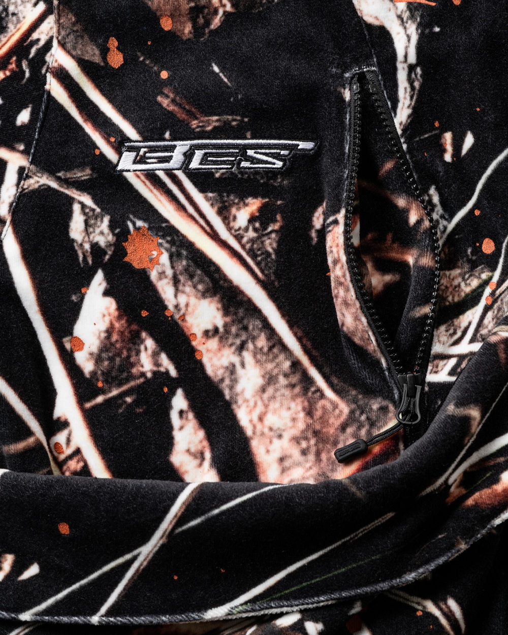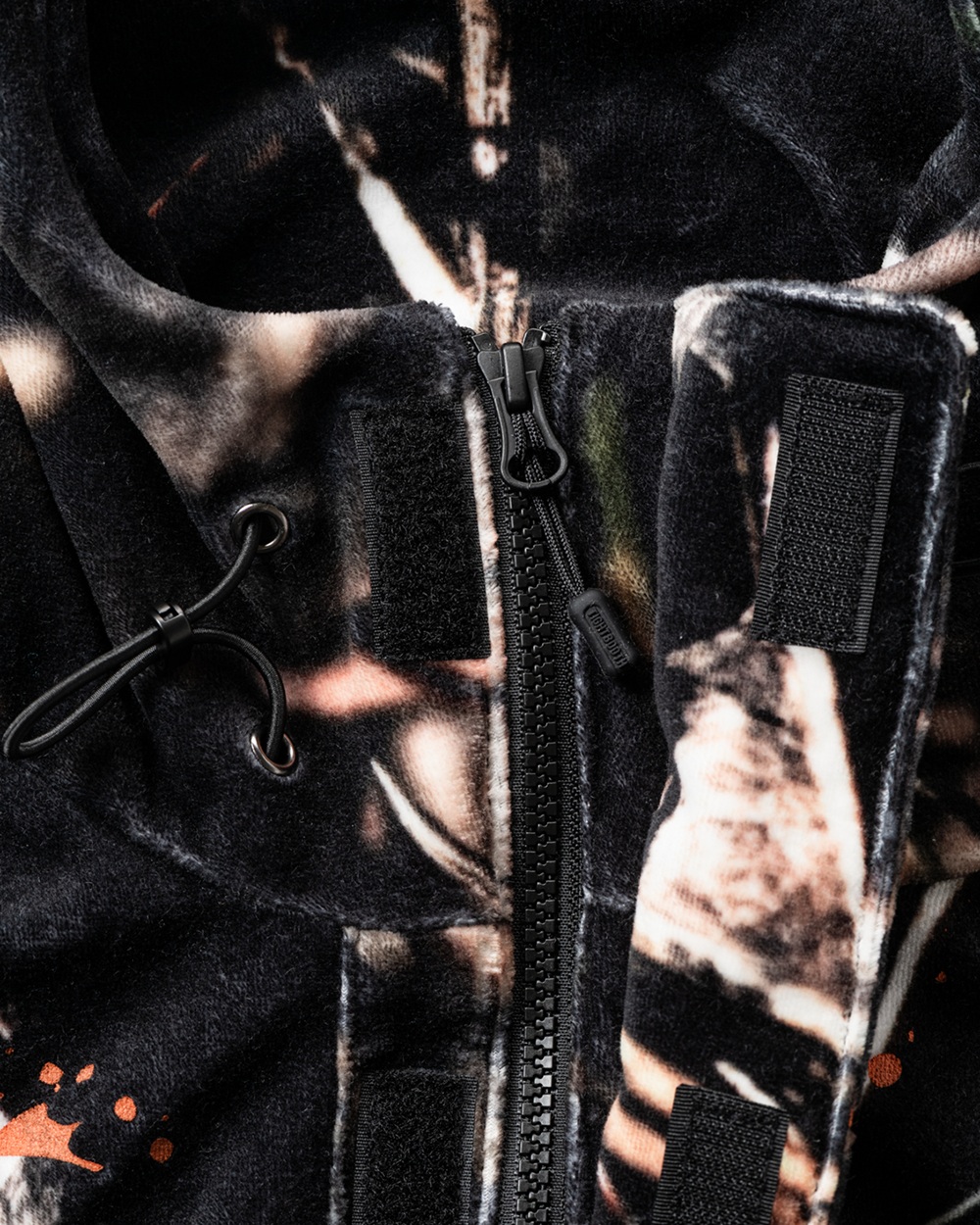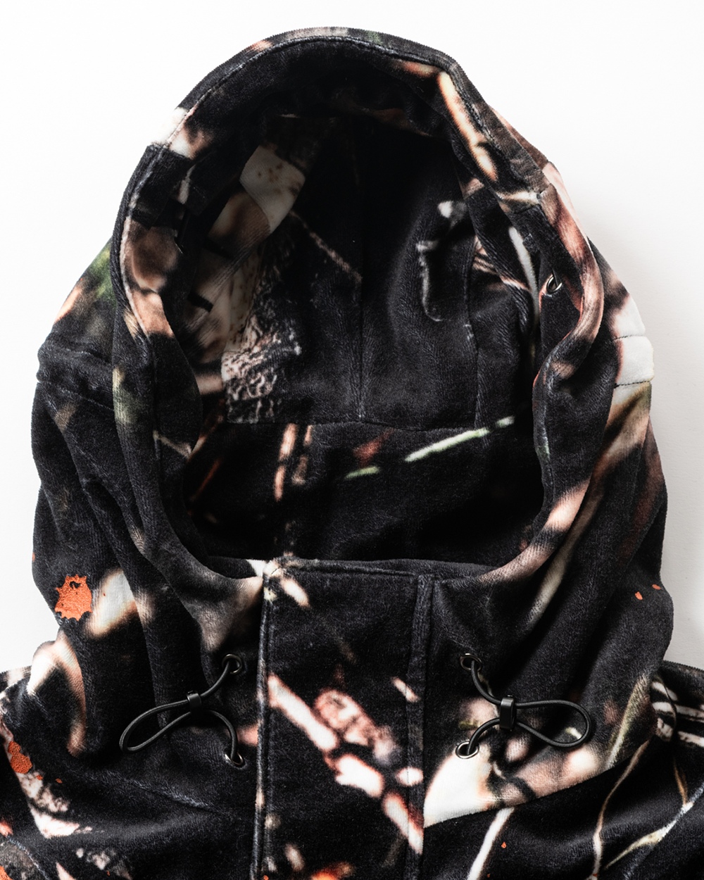 オリジナルCAMOデザインをベロア素材に落とし込んだフードジャケット。