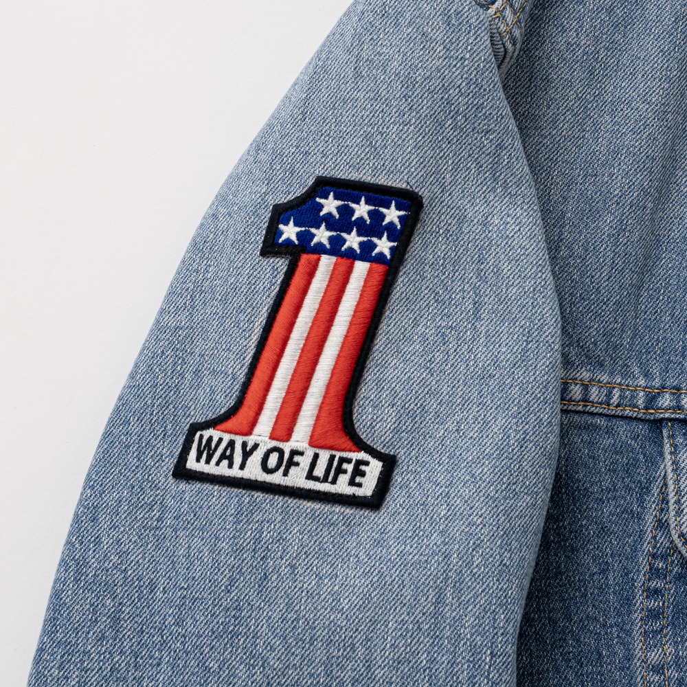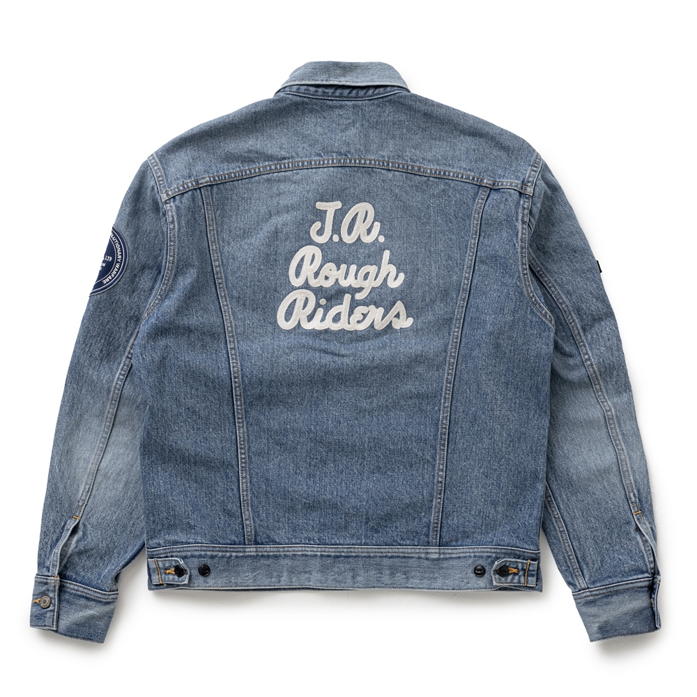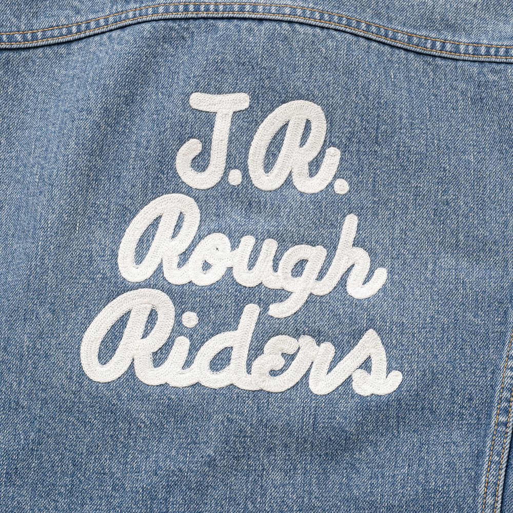 両胸・両肩にオリジナルで作成したワッペン、背面に“JR ROUGH RIDERS”のレターグラフィックをチェーン刺繍で表現したデザイン。