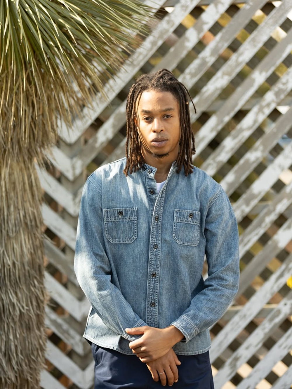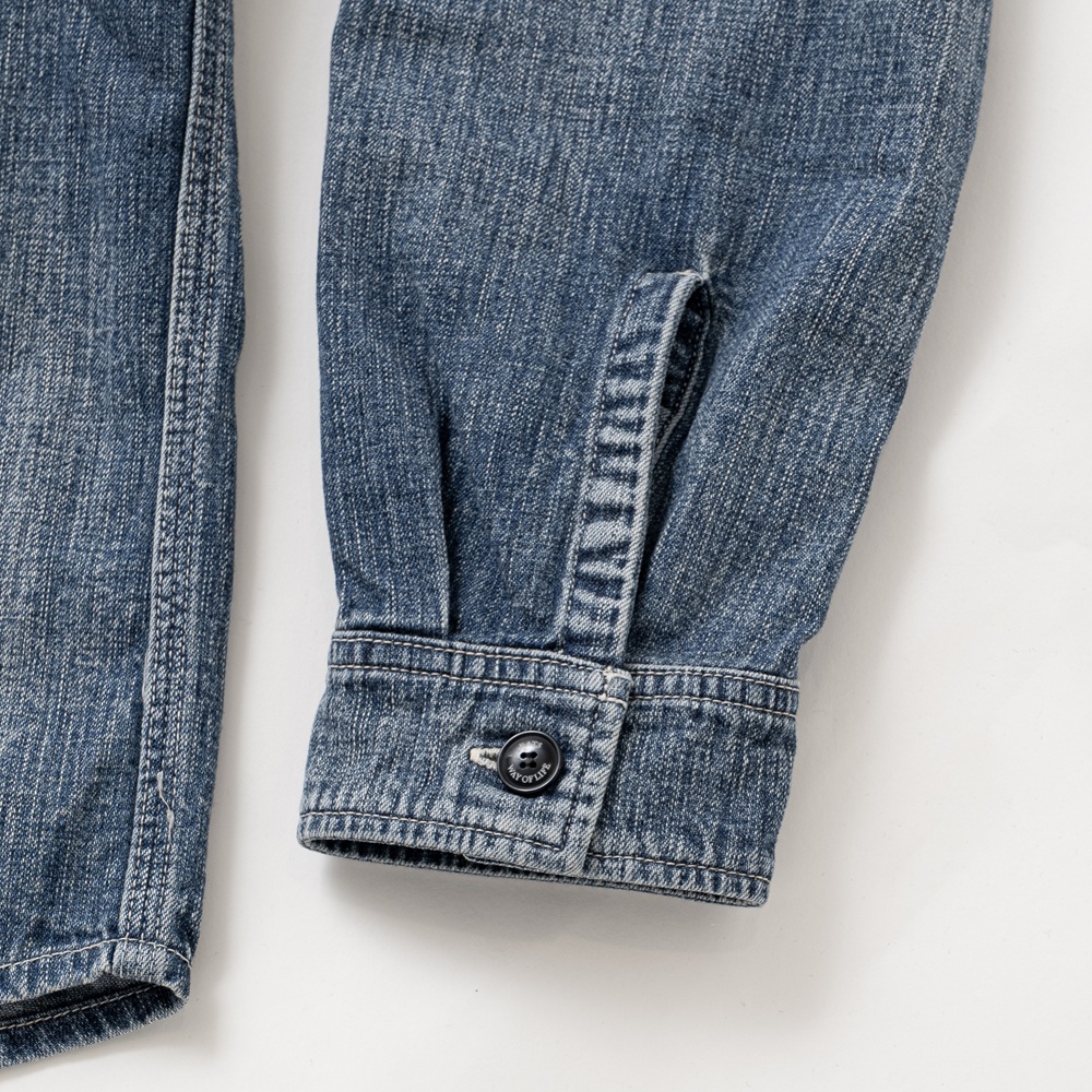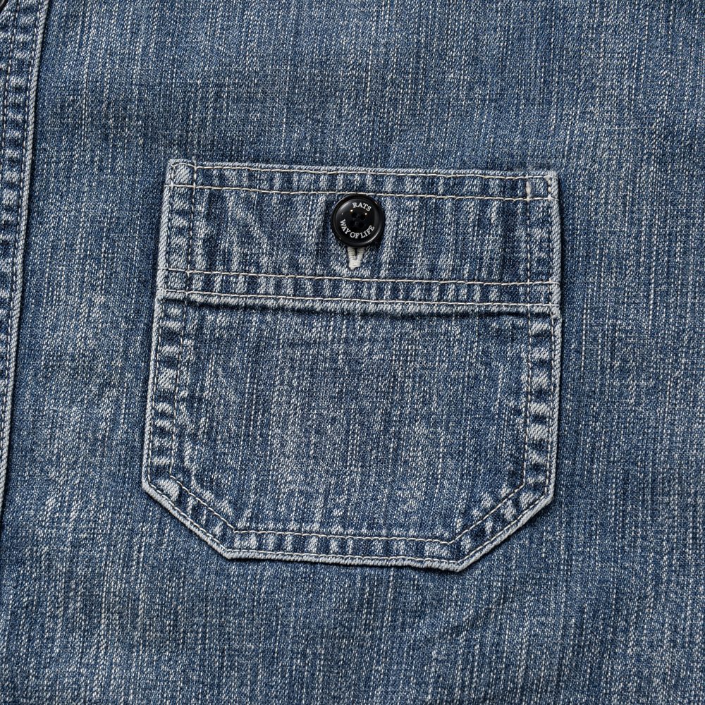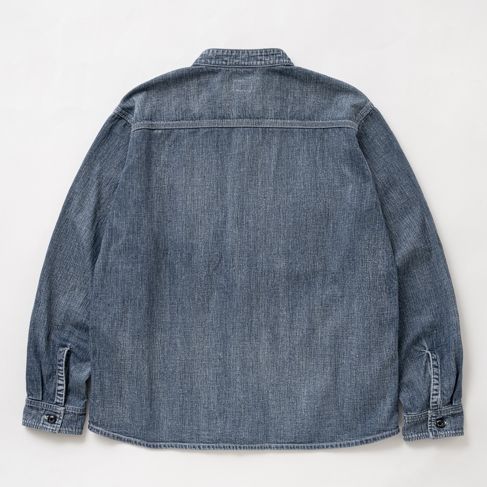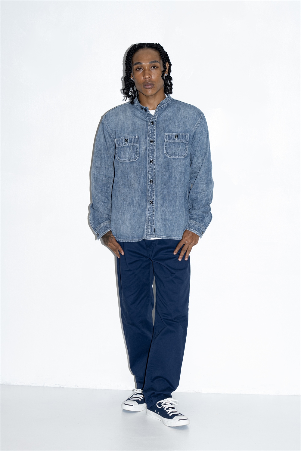 9ozのライトなデニム素材を使用したスタンドカラーデニムシャツ。