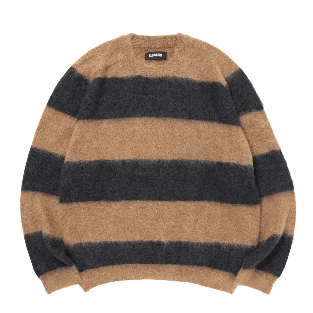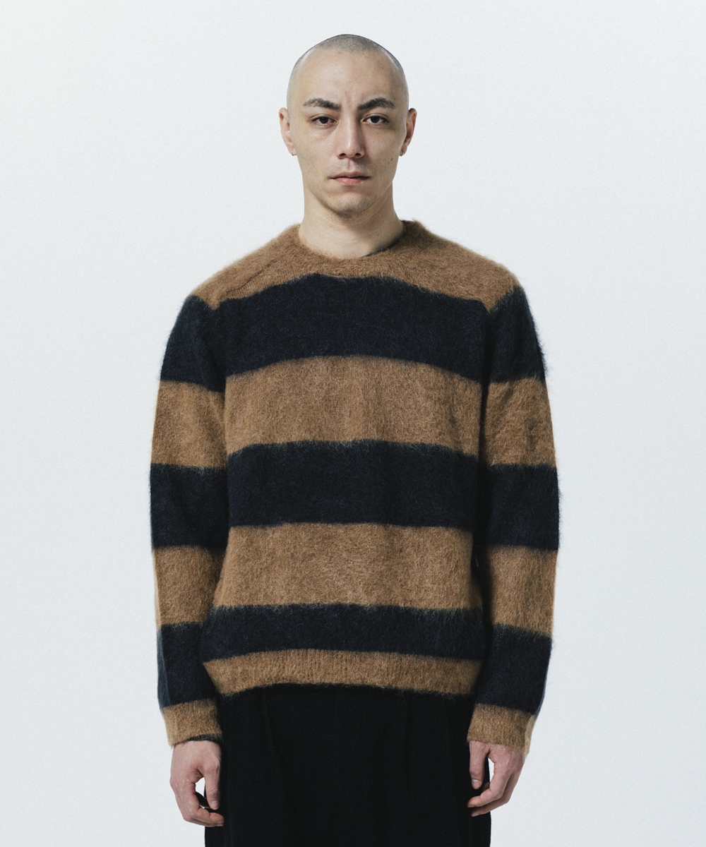 オリジナルのボーダー柄を作成しニットに落とし込んだモヘアクルーネックニットです。